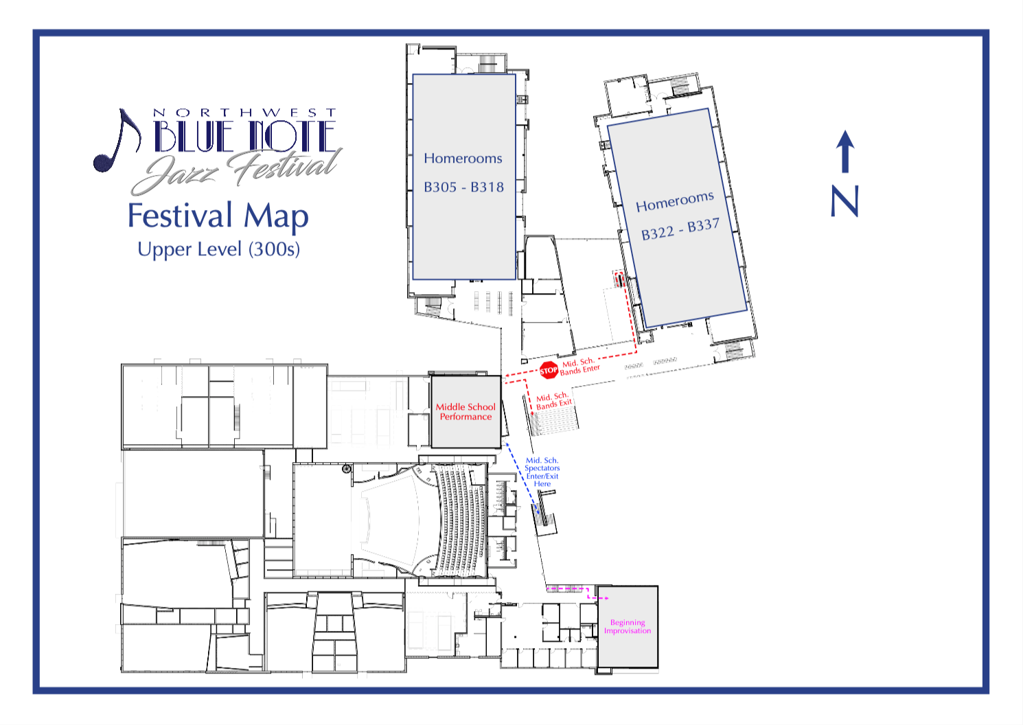 3. Upper Level Map: 2A/3A/4A Performance Center Balcony, Middle School/Second Bands Performance Center, Beginning Improvisation, Homerooms