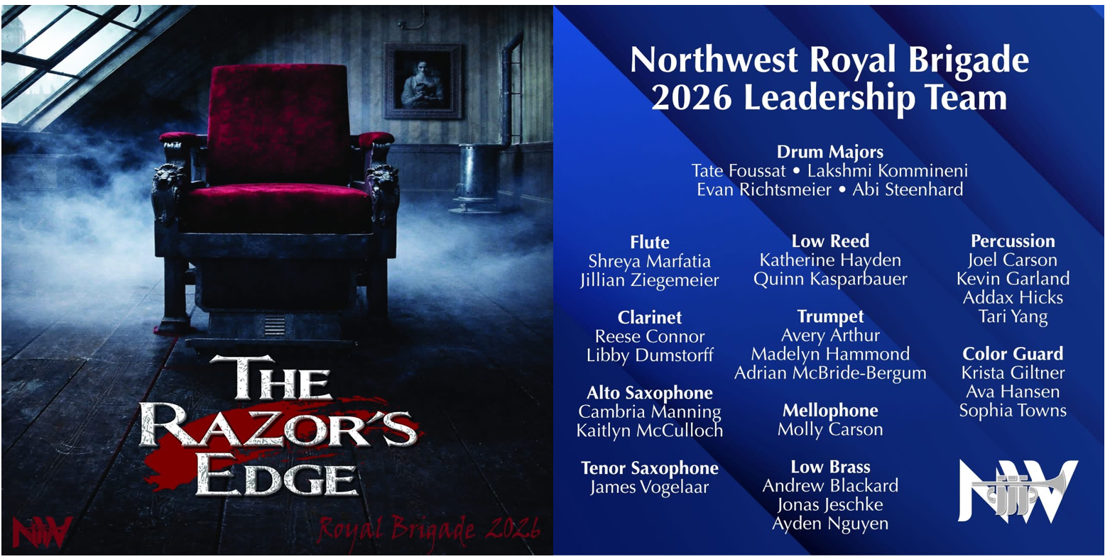 The Northwest Royal Brigade is our outdoor performance ensemble at Northwest High School. Consisting of brass, woodwinds, battery percussion, front line percussion, and color guard, all members of the Northwest Band Program participate in the Royal Brigade during first term.